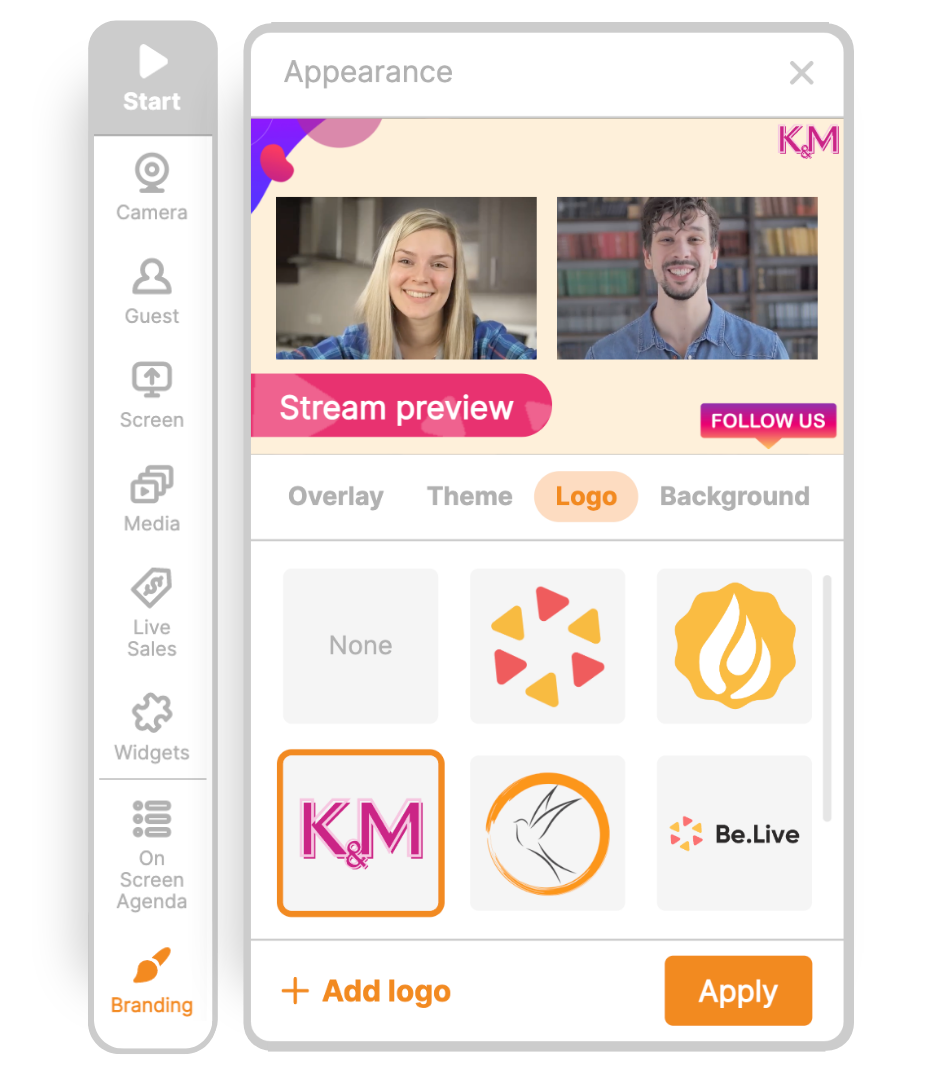 Simplify your branding with Be.Live's easy customization. Upload your logo, static or animated, just once, and it's ready to use in all future broadcasts, enhancing your professional appearance effortlessly.